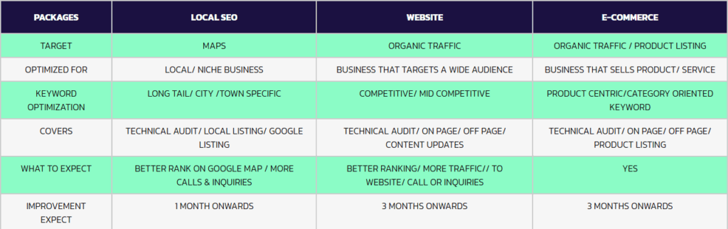 | COVERS | TECHNICAL AUDIT/ LOCAL LISTING/ GOOGLE LISTING | TECHNICAL AUDIT/ ON PAGE/ OFF PAGE/ CONTENT UPDATES | TECHNICAL AUDIT/ ON PAGE/ OFF PAGE/ PRODUCT LISTING |